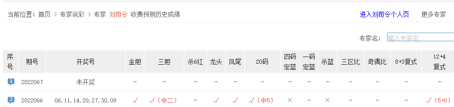 刘司令12+4命中5+0;福神、司徒摘星、数数能手、13055、奥利给啊、彩灵通、好运双胆、皓彩、何金银、千钧一码、雪山白狐、神彩如烟、一战封神等专家命中5红。