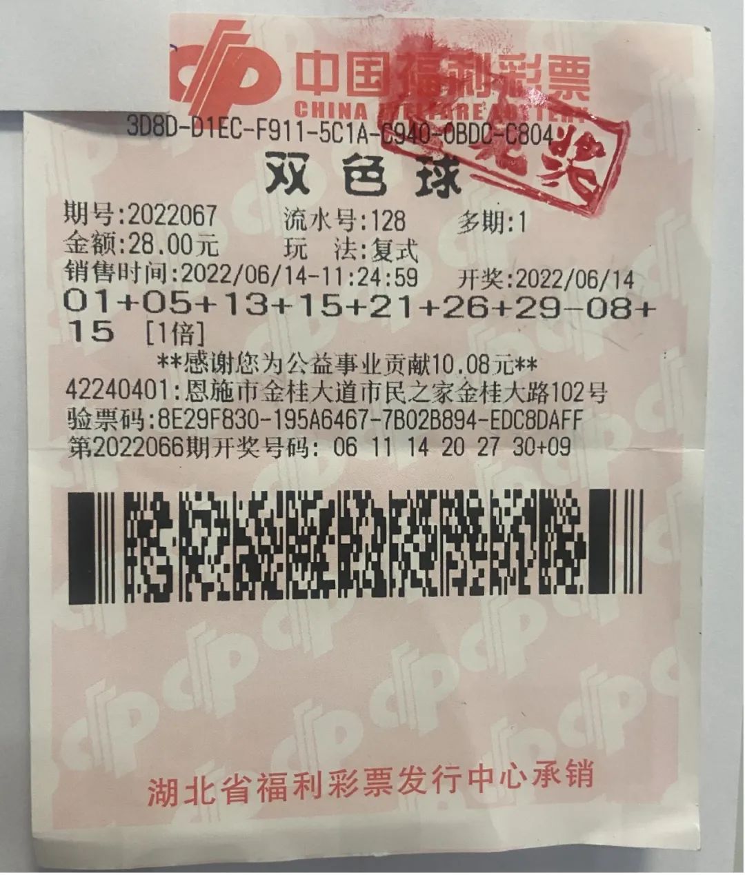 这位先生就是6月14日晚中得双色球第2022067期一等奖695万的大奖得主,恩施购彩者何先生(化姓)。