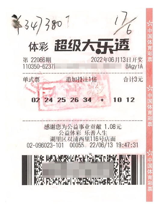 在6月13日开奖的第22066期体彩大乐透中,厦门的张先生以一张3元投入的单式追加票,喜中大乐透追加二等奖,奖金34万余元。