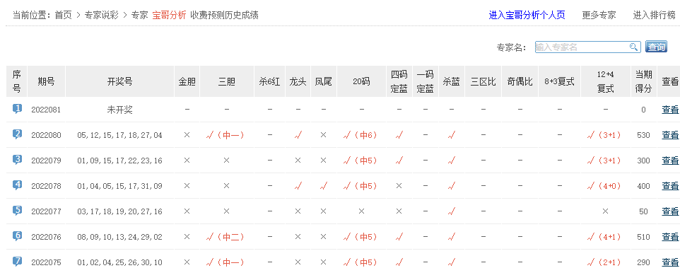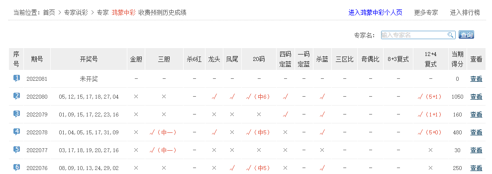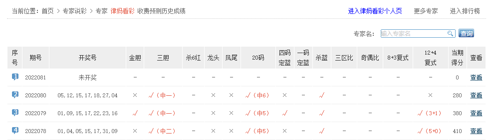 律妈看彩、千年老怪、布衣彩神、好运双胆等专家大底命中6红。
