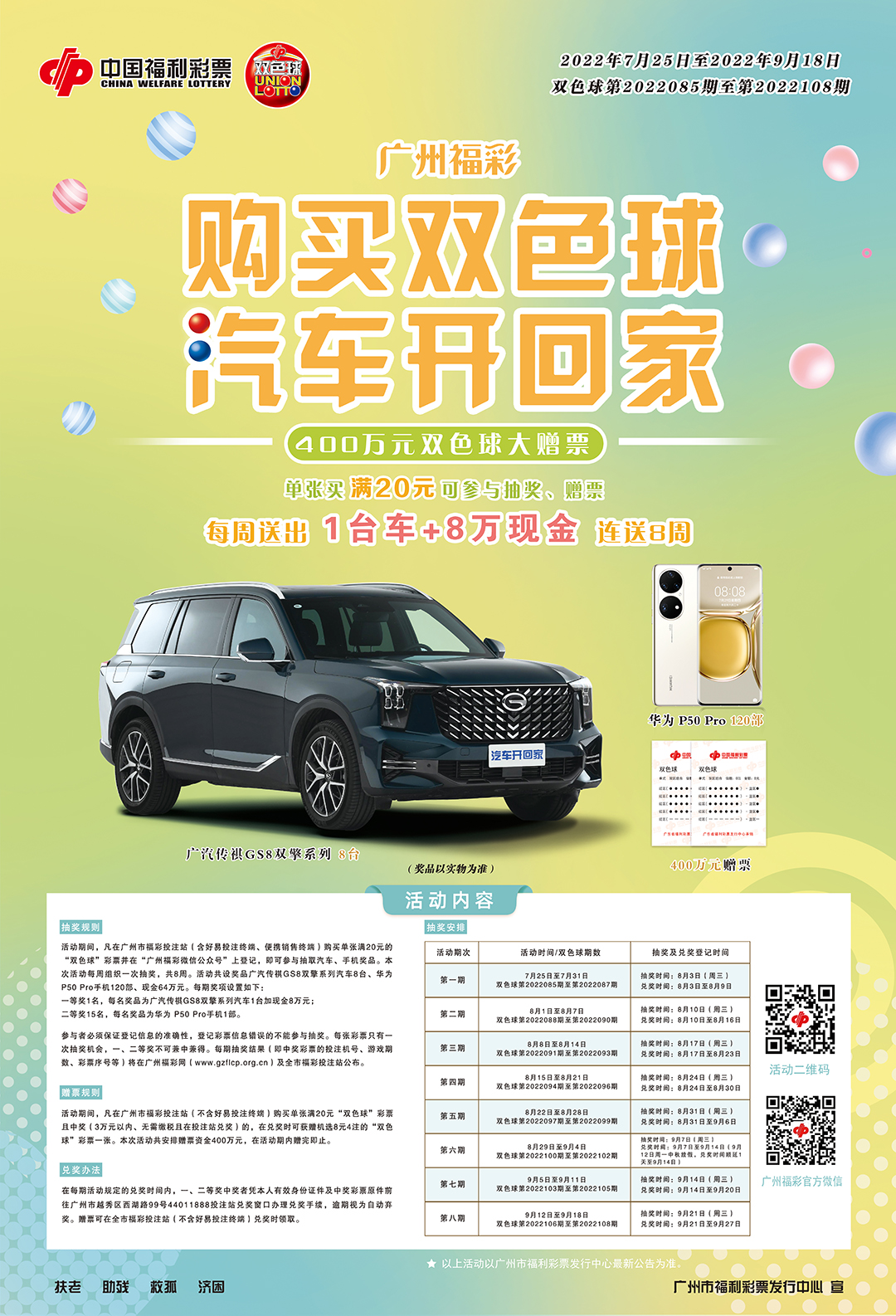 近日,广州市福彩中心发布公告称,将自2022年7月25日启动“购买双色球,汽车开回家”大型营销宣传活动,并首次配套开展400万元双色球大赠票。本次活动将持续开展8周,每周送出1台广汽传祺GS8汽车、15部华为P50 Pro手机。