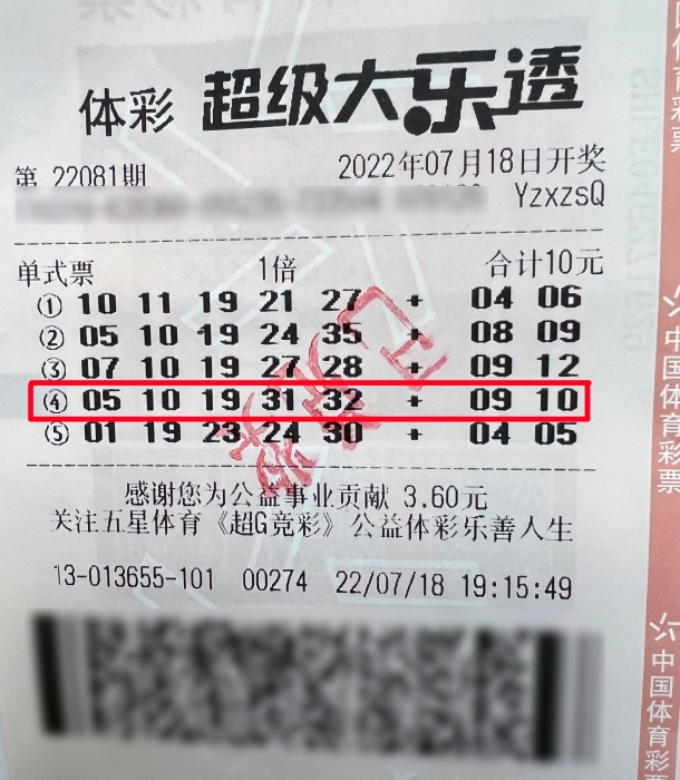 7月18日,体彩超级大乐透第22081期开奖,前区开出号码“05、10、19、31、32”,后区开出号码“09、10”。本期全国销量为2.75亿元,为国家筹集彩票公益金9900万余元。