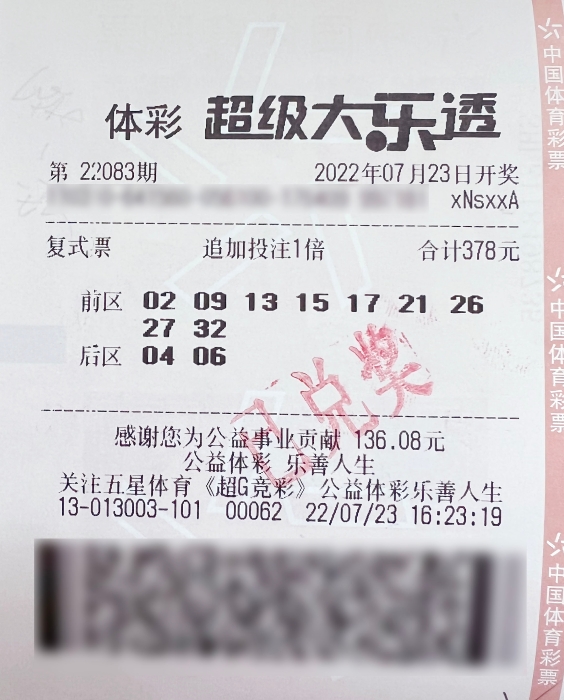 7月23日,体彩超级大乐透第22083期前区开出号码“02、09、17、26、32”,后区开出号码“04、06”。当期全国销量为2.94亿元,为国家筹集彩票公益金1.05亿元,开出的5注一等奖中有2注为追加投注一等奖,奖金为1315万余元(含584万余元追加奖金)分落上海嘉定、广东佛山。