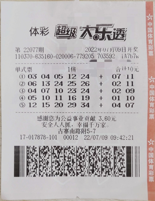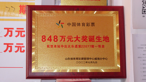 7月9日晚,体彩超级大乐透第22077期开奖,全国共中出7注一等奖,其中1注花落威海,中奖彩票是1张10元投注的5注单式票,奖金848.8万元。