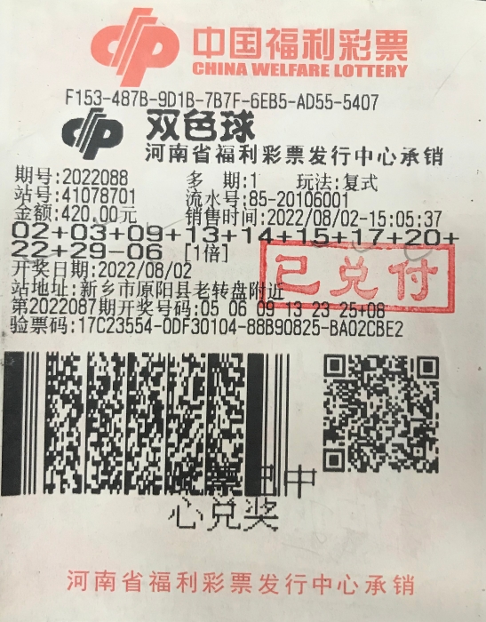8月2日晚,双色球2022088期开奖,新乡市原阳县41078701福彩投注站传出喜讯,该投注站中出1注双色球一等奖,这是原阳县今年第三个双色球大奖。