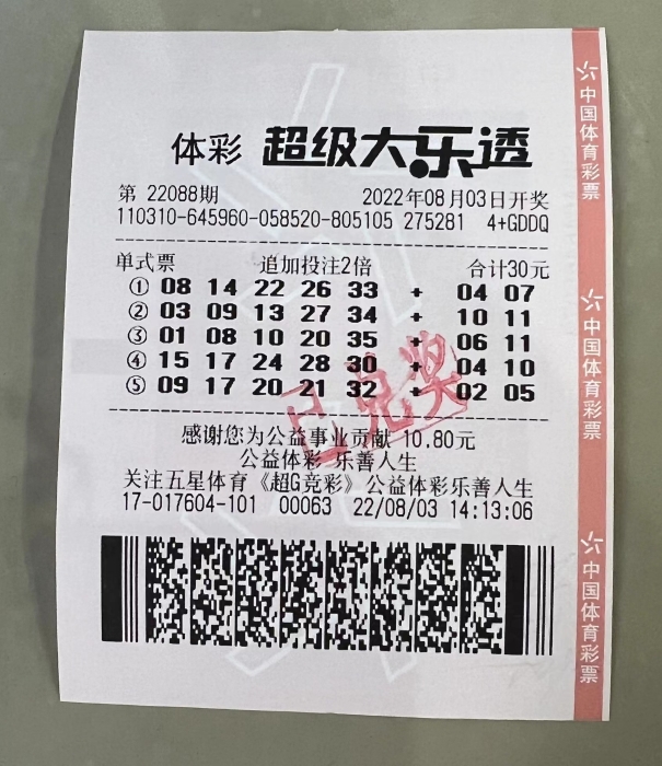 8月3日晚,体彩超级大乐透第22088期开奖,本期全国共开出6注一等奖,其中5注为1596万余元(含709万余元追加奖金)追加投注一等奖,分落上海青浦区(2注)、上海长宁区、江苏南京、江苏苏州,1注为887万余元基本投注一等奖,落在上海浦东新区。