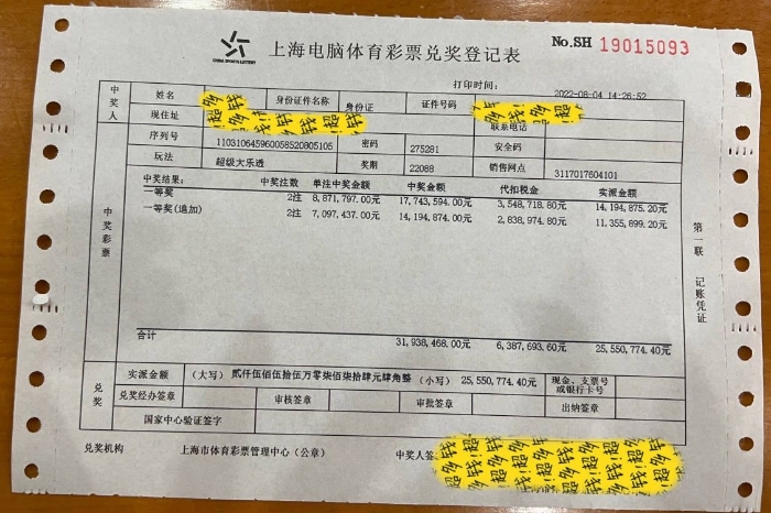 数据显示,本期上海青浦区2注追加投注一等奖出自一张30元面值,2倍追加投注的单式票,单票总奖金高达3193万余元。中奖网点位于青浦区盈浦街道盈中西路216号,网点编号17604销售点。8月4日下午,中奖者王先生(化姓)已在家人的陪同下完成火速兑奖。