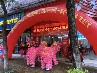 8月17日,44131455投注站负责人左先生夫妇将站点打扫一新,摆上花篮,拉好中奖横幅,还请了醒狮队舞狮一番,跟大家庆祝站点历史性一刻。附近商铺的工人及路过行人都纷纷驻足停留观看,感受现场喜庆气氛。