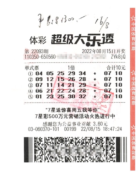 漳州千万大奖获得者的中奖彩票是一张8+3复式票,据购彩者回忆,8月11日,他和爱人将车停在停车场后,想起近一个月没买彩票,就到漳州市龙文区福隆城毅达世纪新城南区6幢D055号30169实体店买了这张复式票,“号码是自选的,没有特殊的意义。”8月13日晚,大乐透开奖,当看到中奖号码后,他感觉有些熟悉,于是拿出彩票核对,确定中得大奖后,他立刻同爱人分享了这一喜讯。尽管之前也中过不少小奖,但这次中得大奖,让夫妻俩喜出望外。