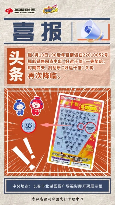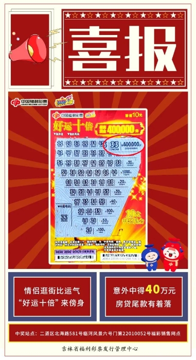 8月19日,长春市福彩中心传来喜讯,一对90后年轻情侣在二道区北海路581号临河风景六号门第22010052号福彩销售网点,喜中福彩即开型彩票“好运十倍”40万元大奖!