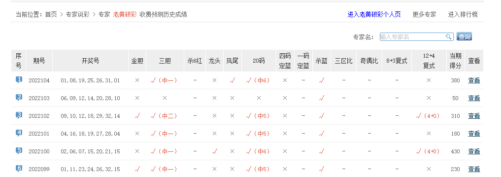 老黄研彩、战神归来、财源看彩、风扬数据、弈彩阳天等专家中6红。