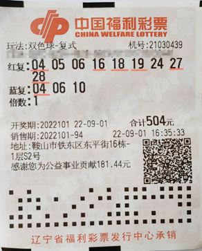 其中一注一等奖出自鞍山439号彩站,该站位于鞍山市铁东区东平街16栋-1层S2号,彩票购买时间为9月1日16点35分,流水号94,采用机选、9+3复式投注,花费504元。除收获1注一等奖外,还中得2注二等奖,18注三等奖,81注四等奖,110注五等奖,奖金合计5,820,767元。