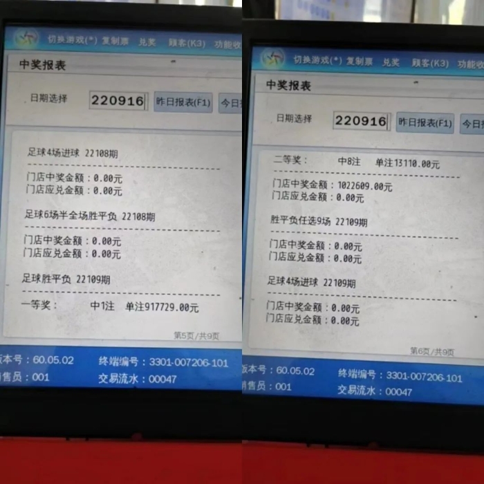 9月15日,传统足彩14场胜负游戏第22109期开奖,位于杭州市萧山区义桥镇湘南村(后坛)兴达公司旁的3301007206体彩实体店传来好消息,购彩者李先生凭借一张复式票喜中传统足彩14场胜负游戏当期一等奖1注,二等奖8注,共计收获奖金1022609元。