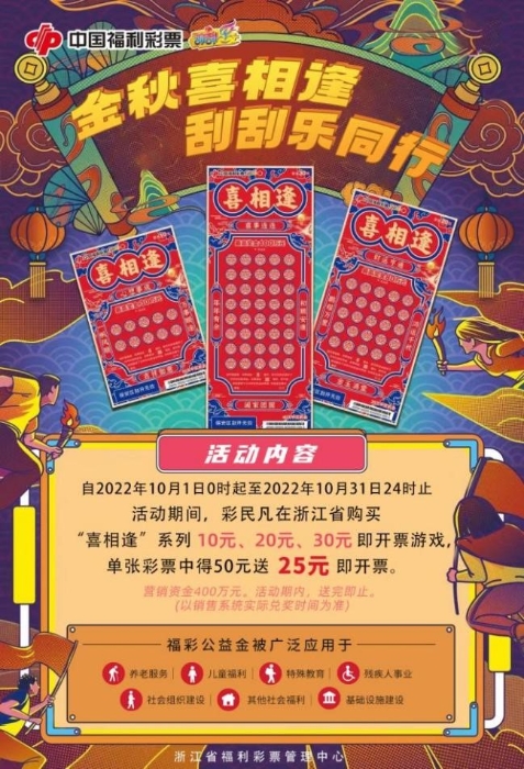 活动期间,购彩者凡在浙江省内购买“喜相逢”系列10元、20元、30元即开票,单张彩票中得50元,不仅可兑换50元现金奖金,还可额外获赠25元即开票。共计将派送400万元即开票,送完即止。需要注意的是,本次活动时间为2022年10月1日0时至2022年10月31日24时(以销售系统实际兑奖时间为准),在该时段内符合条件的中奖者到福彩刮刮乐销售点兑奖才能获得派送的彩票,未能在规定时间内兑奖,则视为主动放弃。