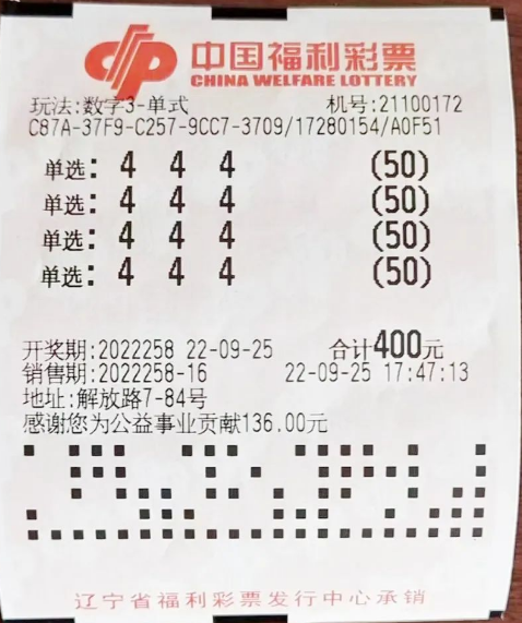 2022年9月25日晚,中国福利彩票“3D”第2022258期开奖号码为“4、4、4”。辽阳福彩第21100172号站传来喜讯,该站一彩友喜中单选奖200注,收获奖金208,000元。