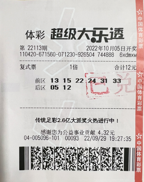 10月5日晚,体彩大乐透第22113期开奖号码为:13+15+22+31+33 05+12,全国共产生3注一等奖,其中1注花落湖北武汉。10月8日一大早,武汉购彩者顾先生(化姓)第一时间来到省体彩中心兑领这份“开工”大礼。