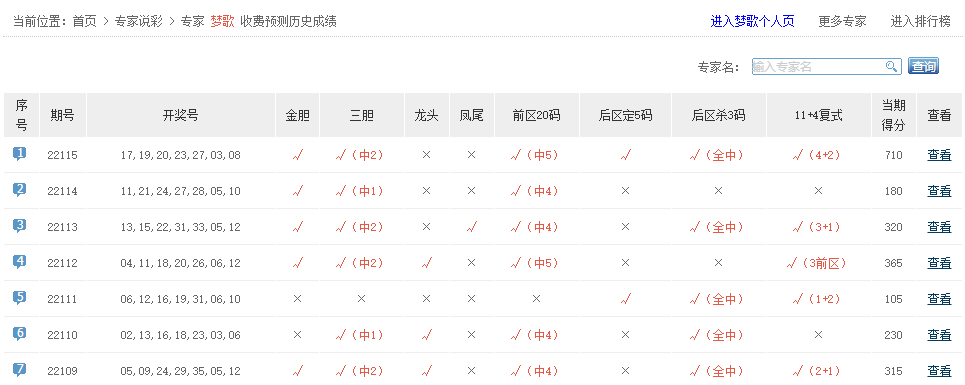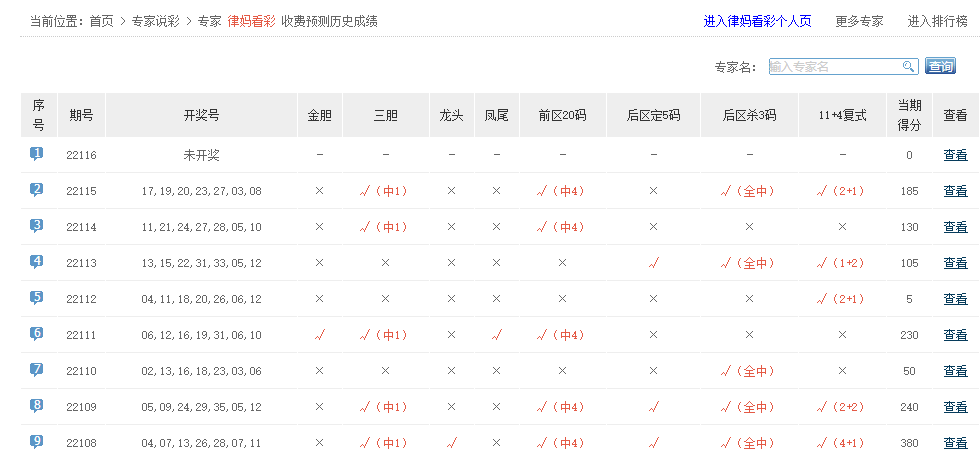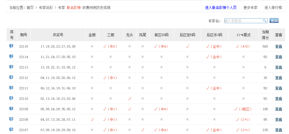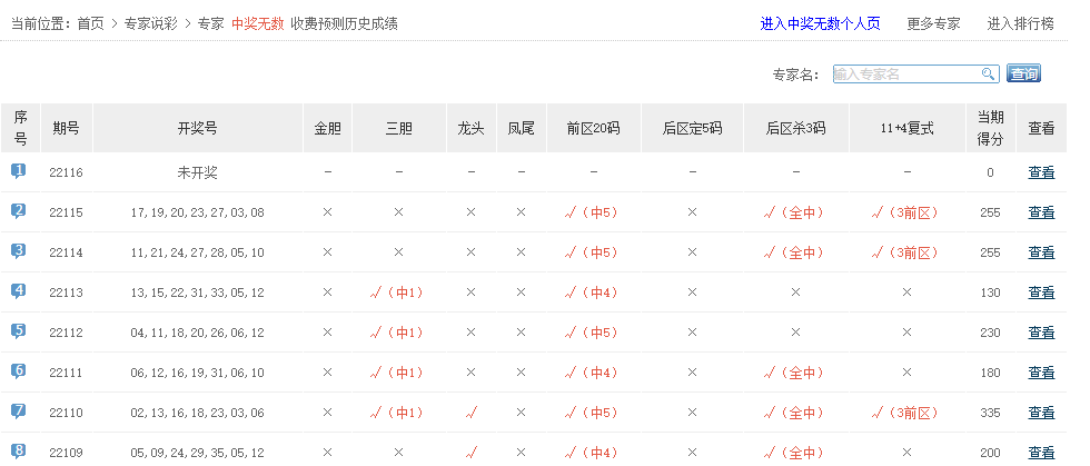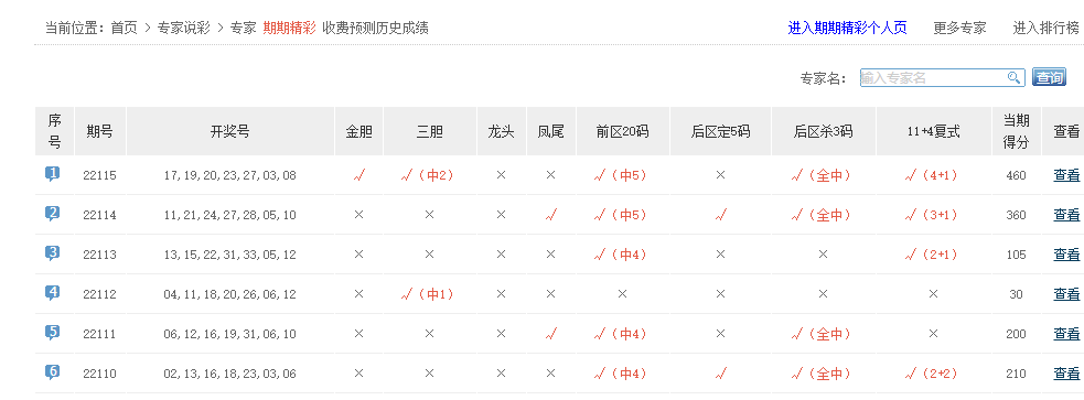 中奖无数、彩精讲、幸运神码等专家名字5+0。