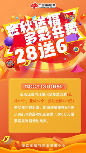 好消息,大家非常熟悉的双色球“28送6”赠票活动又来了!为回馈广大购彩者对双色球的喜爱和支持,浙江福彩再次开启“28送6”活动,将送出1200万元彩票。
