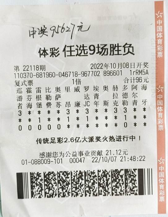 传统足彩2.6亿派奖活动已过半,济南购彩者不断收获惊喜和好运。22118期传足再传捷报,济南购彩者收获6注任选9场一等奖,单注奖金95,627元。