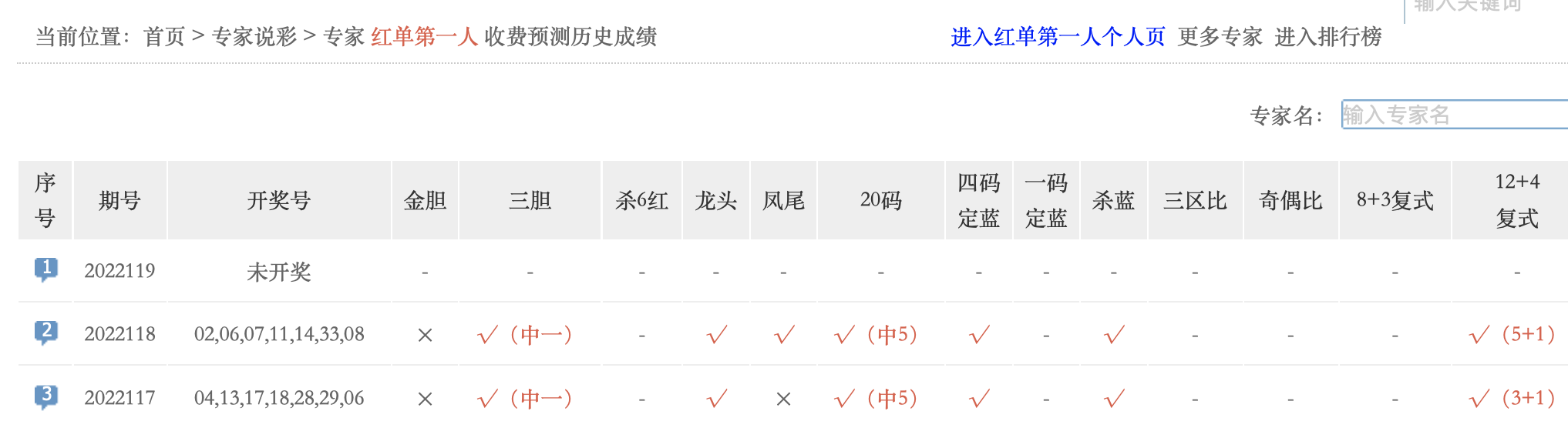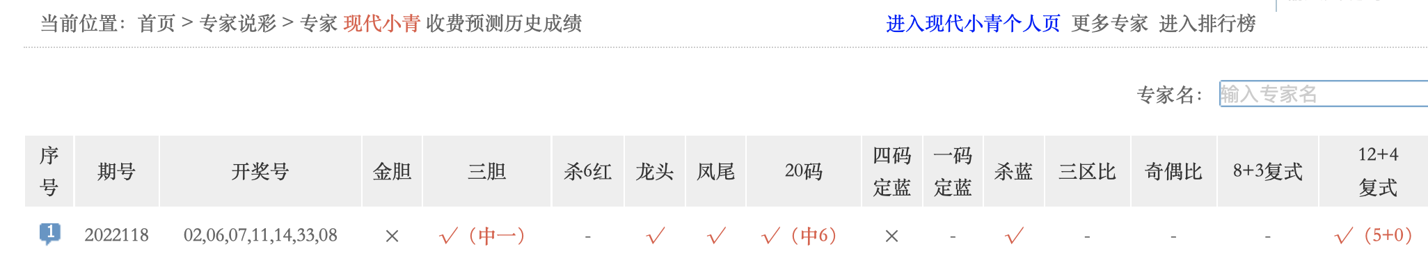 红单第一人12+4命中5+1。大联盟、彩八仙、彩达人、飞雪绒花等专家中5红1蓝。