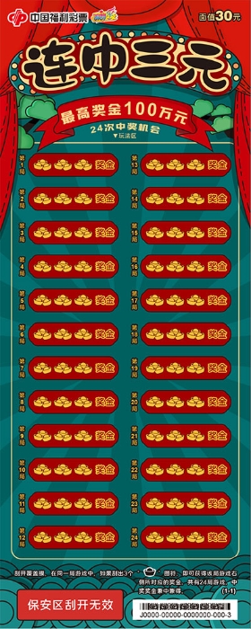 “连中三元”采用经典的“三同图”的玩法,与“连中三元”的名称也十分契合,寓意极佳。刮开覆盖膜,在同一局游戏中,如果刮出3个“元宝”图符,即可获得该局游戏右侧所对应的奖金。共有24局游戏,中奖奖金兼中兼得。