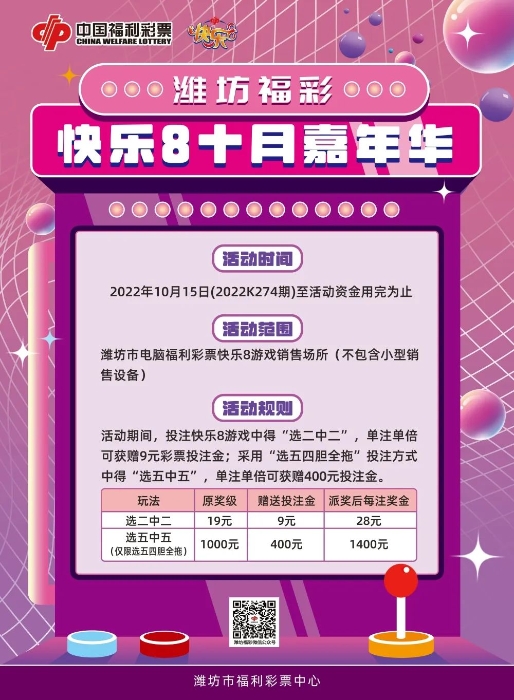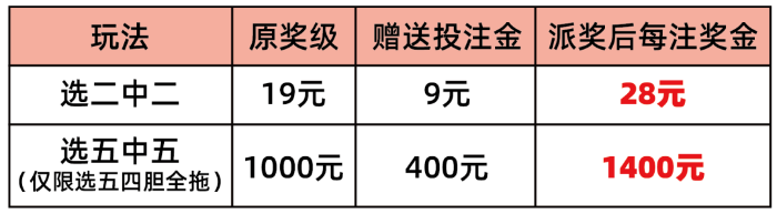 活动期间,在潍坊市电脑福利彩票快乐8游戏销售场所(不包含小型销售设备)投注快乐8游戏中得“选二中二”,单注单倍可获赠9元彩票投注金;采用“选五四胆全拖”投注方式中得“选五中五”,单注单倍可获赠400元投注金。