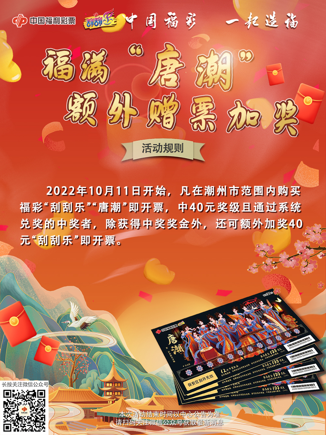 眼下“福满唐潮,额外赠票加奖”活动仍在火热进行中,希望各位彩民踊跃参加到活动中来,再次邂逅幸运!