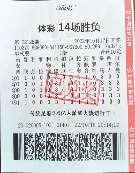 目前,传统足彩2.6亿派奖仍在火热进行中,截至10月31日,派奖期数还有2期,喜欢传统足彩玩法的购彩者一定不要错过这次机会,抓紧去身边的体彩站体验吧,说不定您也可以收获属于您的惊喜大奖。(赵悦)
