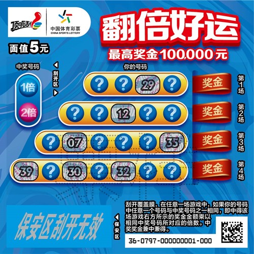 “翻倍好运”系列共分5元、10元、20元三个票面。“翻倍好运” 5元票采用多个游戏号码的玩法设计,游戏区“你的号码”部分号码是未覆盖的明码,增加了选择的主动性,强化了游戏的体验感。该票共有4次中奖机会,最高奖为10万元。刮开覆盖膜,在任意一场游戏中,如果你的号码中任意一个号码与中奖号码之一相同,即中得该场游戏右方所示的奖金金额乘以相同中奖号码所对应的倍数。中奖奖金兼中兼得。“翻倍好运”10元票设计以及游戏规则与5元票如出一辙。该票共有7次中奖机会,最高奖为25万元。