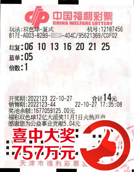 深秋时节,天气渐凉,但购彩者的热情从未减低。在双色球第2022123期中,天津购彩者凭借一张14元的“7+1”小复式,喜中1注一等奖,6注三等奖,共计757万元大奖,在天津彩市再掀一阵“双色球热”。