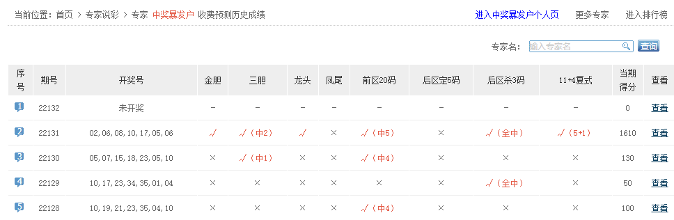 中奖暴发户11+4命中5+1;神码妙算、凤雏测号、光彩照人、大圣看彩、中奖暴发户、彩彩迷砖家、民财神等专家大底命中5+1。