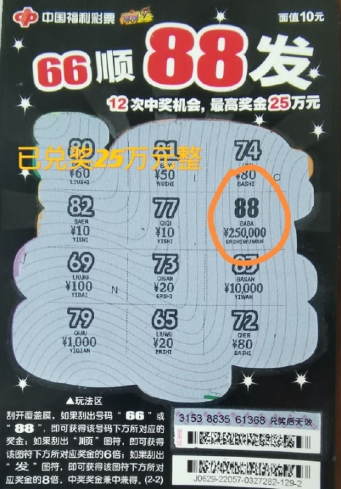 据该站业主介绍,11月12日中午,一位女士进到站点买刮刮乐彩票,问业主有什么品种的刮刮乐,业主告诉她有很多品种,但目前“66顺88发”的刮刮乐只剩2张彩票,问她要不要?这位女士说:“要,捡漏。”于是就买了这两张“66顺88发”的刮刮乐来刮,刮到第二张时该张彩票出现了有“88”的图案,“88”下面显示是“250,000”字样,她扬起手中的彩票,激动大呼着“中了25万”。她这么一喊,旁边的人也围了过来看热闹,就这样捡漏中得了25万元大奖的她随即成为投注站的焦点,中奖的激动和喜悦顿时洋溢在站点的每个角落。