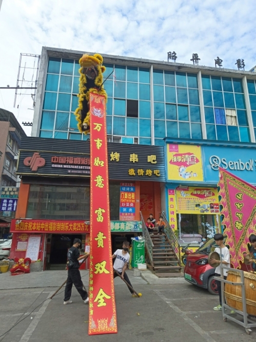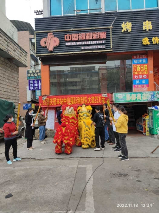 2022年11月18日上午,位于贺州市昭平县电影院门口的福彩第45041937号投注站门口锣鼓喧天,醒狮庆贺礼炮齐放,站门口挂着“热烈庆祝本站中出福彩刮刮乐大奖25万元!”的宣传横幅和宣传海报,原来11月12日该站中出刮刮乐“66顺88发”头奖25万元,该投注站正在举行的庆祝活动。