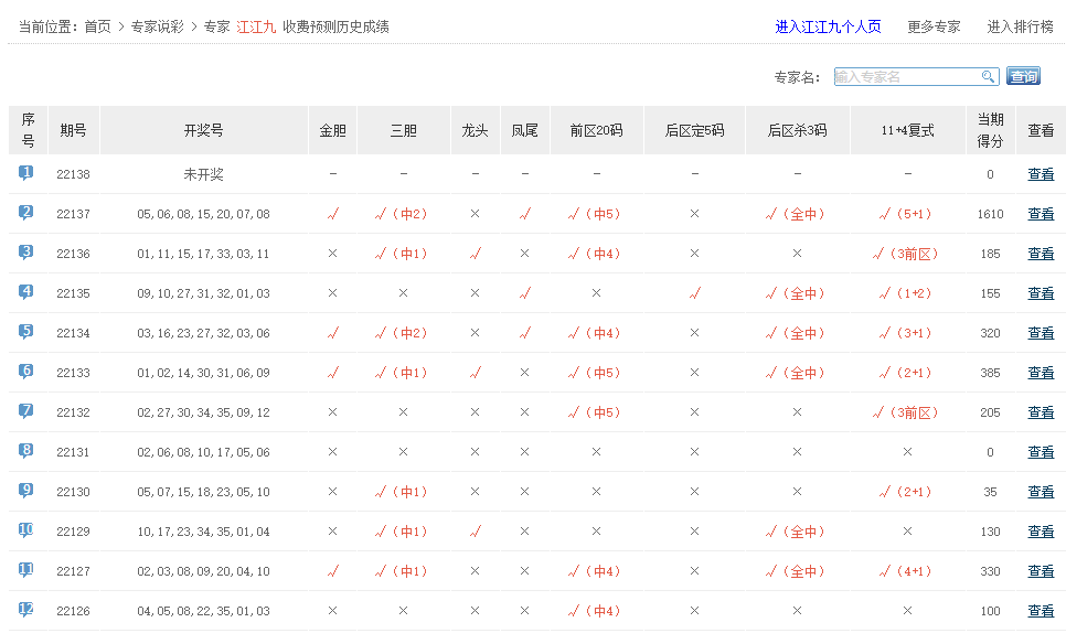 江江九11+4命中5+1;神十三、金码神算、动彩乐命中5+1。