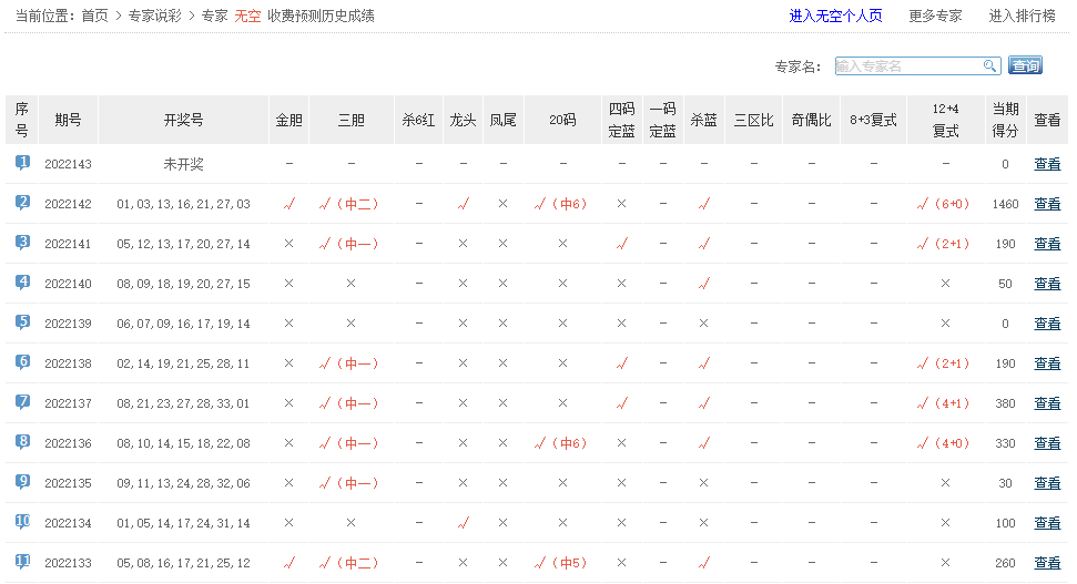 无空复式12+4命中6+0;看彩精英、金牌预测、暖神、中国力量命中6红。