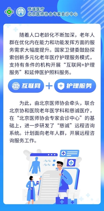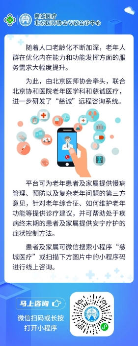 为此,北京医师协会牵头组织了“以老年医学远程咨询为支撑的老年人分级诊疗网络体系构建”项目,联合北京协和医院老年医学科和慈诚医疗,在“北京医师协会专家会诊中心”的基础上,进一步研发了“慈诚远程咨询系统”。面向老年人群,开展远程咨询服务。