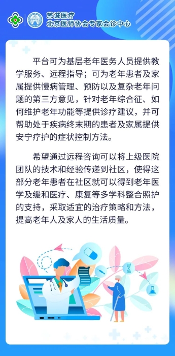 希望通过远程咨询服务将上级医院团队专业的医疗技术和经验传递到基层社区,让老年患者在社区就可以享受到老年医学及缓和医疗、康复等多学科整合照护的服务,采取适宜的治疗方式和手段,保障老年人的身体健康,提高老年人及其家庭的生活质量。