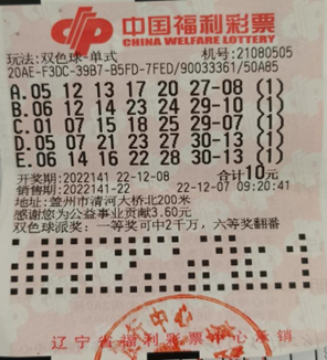12月8日,中国福利彩票第2022141期开奖,当期红球开奖号码为:05、12、13、17、20、27 蓝球:14。营口福彩第三次中出双色球二等奖一注,奖金257603元。中出二等奖的代销站位于盖州市清河大桥北200米,福彩第21080505号代销站。