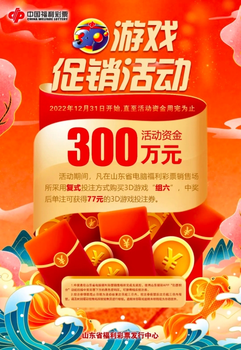 12月31日,山东福彩3D游戏促销活动火热来袭。活动期间,凡在山东省电脑福利彩票销售场所采用复式投注方式购买3D游戏“组六”,中奖后单注可获得77元的3D游戏投注券。全省累计送出300万元投注券!