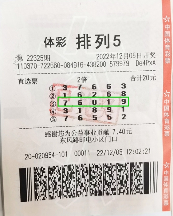 说起中奖经过,李女士回忆道:“我是不久前在万达广场购物时看到‘一家超好玩的店’,被吸引过去才开始了解体育彩票的。当时我在现场体验了超级大乐透、7星彩、顶呱刮等不同游戏的玩法,最后还是喜欢排列5玩法,它号码少,玩法简单,让我觉得离大奖更近一点。之后我路过体彩投注站的时候,都会进店选上几注心仪的号码。每次也不会买太多,就根据灵感来上一二十块钱的。这次我突然对7和6这两个号码很有信心,就组合成5注号码下单,还进行了倍投。没想到开出号码‘7 6 0 1 9’,我的第三注号码完美命中,竟然中得了20万元奖金!我和家人都特别开心,虽然一直没来兑奖,但都已经规划好了奖金用途。”说起购彩经历,李女士仍激动不已。