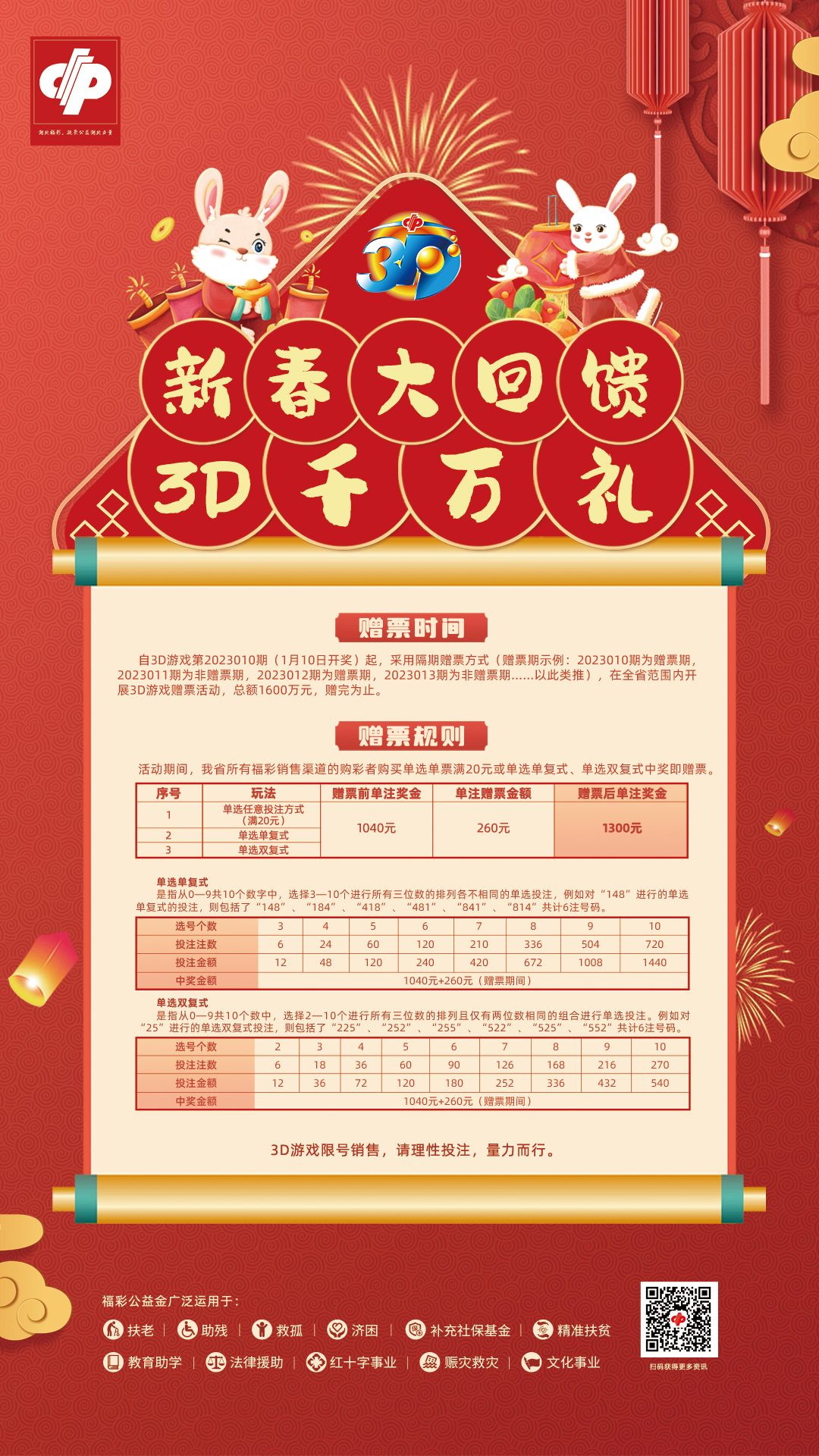 为回馈广大购彩者,癸卯(guǐ mǎo)兔年来临之际,湖北福彩决定自1月10日起,采用隔期赠票方式(赠票期示例:2023010期为赠票期,2023011期为非赠票期,2023012期为赠票期,2023013期为非赠票期…….以此类推)开展3D游戏1600万元大赠票。活动期间,湖北省内所有福彩销售渠道的购彩者购买“单选”(即直选)任意投注方式单票满20元或单选单复式、单选双复式中奖即赠票,赠票后单注中奖奖金由1040元增加至1300元。