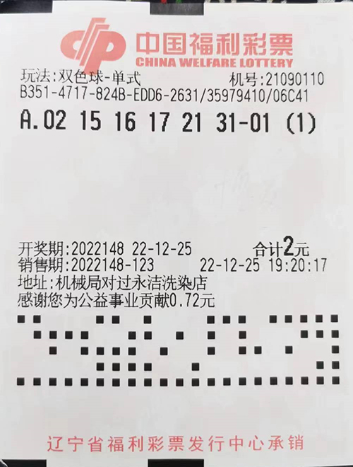 12月25日晚,双色球游戏第2022148期开奖,阜新彩友中得二等奖一注,大奖出自阜新市第21090110号站,中奖彩票是1张机选2元彩票。