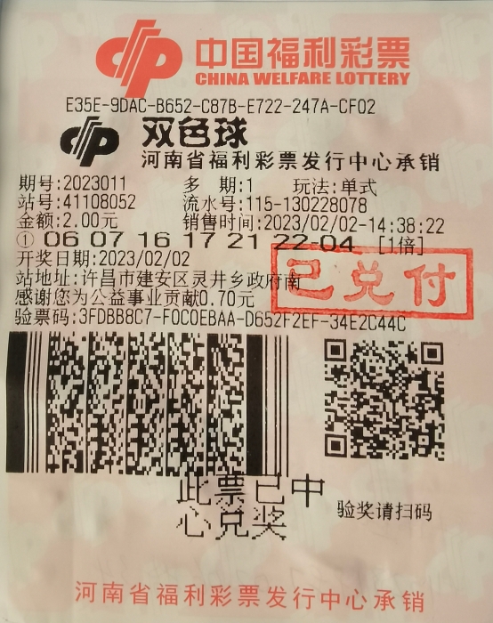 从河南省福彩中心获悉,这注一等奖出自该大奖出自许昌市建安区灵井乡政府南41108052福彩投注站,为一张单式2元票,奖金617万元,喜中新年“头彩”。