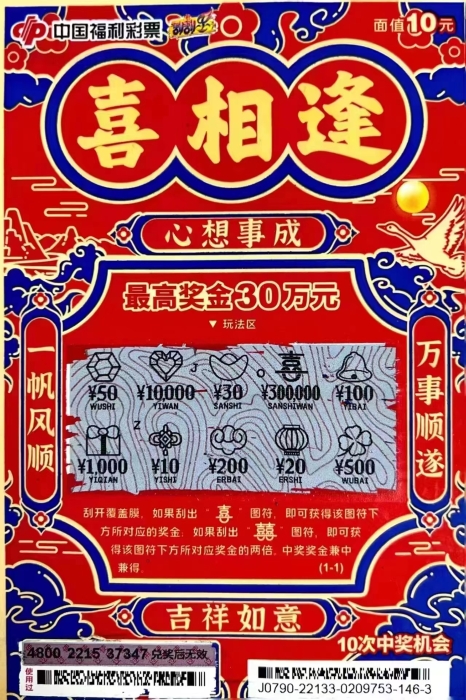 张先生对这款“喜相逢”的刮刮乐彩票很是喜欢,就选了一张面值10元的“喜相逢”,刮开彩票中得10元,他感觉自己运气还不错,当即又选了一张“喜相逢”刮了起来,当他指尖在玩法区挥动间,突然刮出了“喜”图符,发现该图符下方对应的数字为“300000”,按照该票种的游戏规则,即中得该张彩票30万元的大奖。