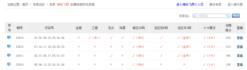 神采飞昂11+4中4+2;乐小星、watsons、我是小小菜、彩数缘、路灯下命中4+2。