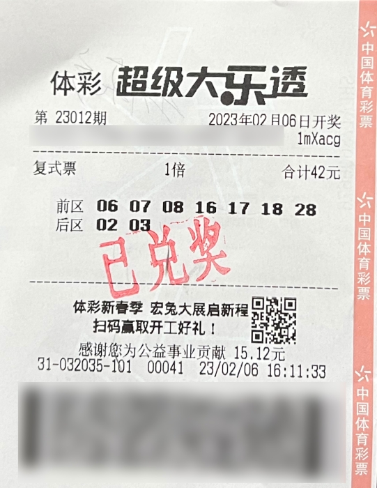 2月6日,体彩超级大乐透第23012期开奖,前区开出号码“07、16、17、18、28”,后区开出号码“02、03”。本期全国销量为2.74亿元,为国家筹集彩票公益金9892万余元。