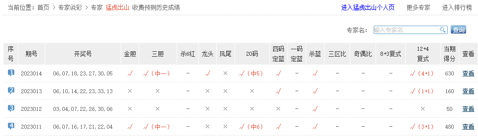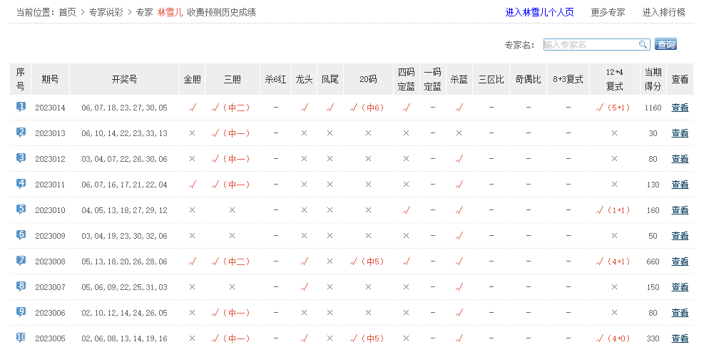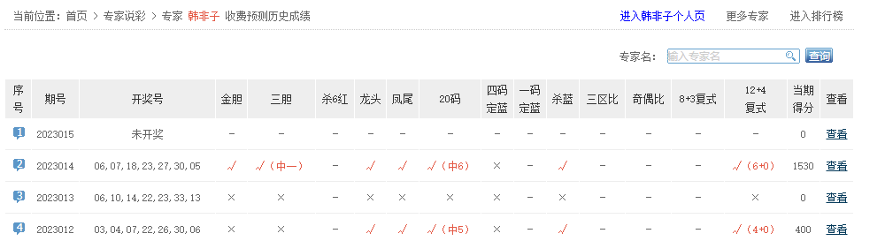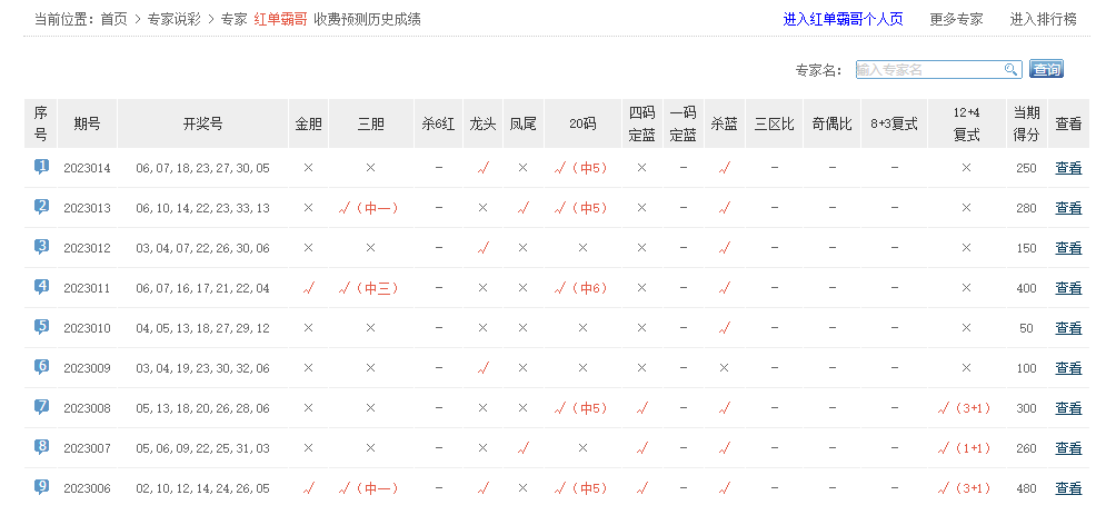 红单霸哥、面气灵、龙行彩市、李来、人生无处不青山、千年老怪、彩分析、虚云、易彩指归、大眼瞪小眼、无铭等专家名字5红。