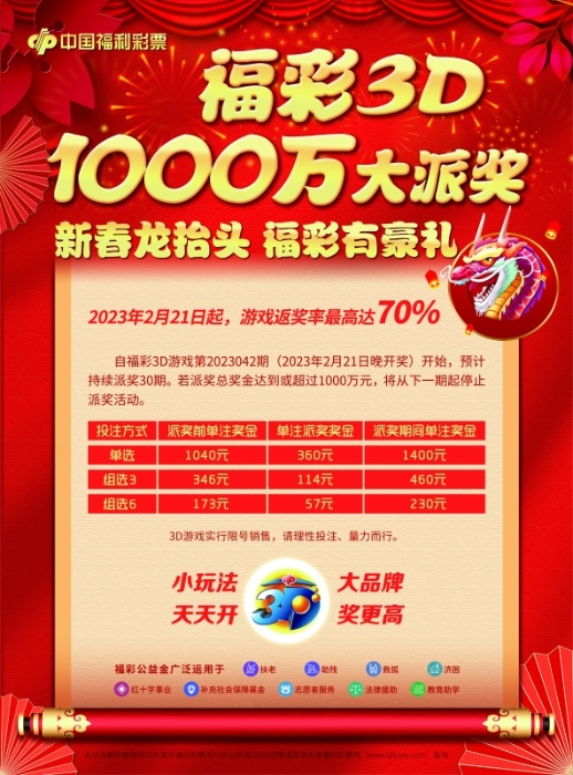 一年一度的天津福彩3D游戏千万大派奖又开始啦!奖金更高,力度更大,购彩者自3D游戏第2023042期(2023年2月21日晚开奖)开始,预计持续派奖30期,派奖总奖金1000万元!派奖期间,单选玩法的单注奖金从1040元提高至1400元,组选三玩法的单注奖金从346元提高至460元,组选六玩法的单注奖金从173元提高至230元。