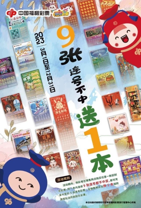 2023年3月1日至2023年12月31日,购彩者在销售网点购买任意一款刮刮乐彩票,同一本内连续9张连号都不中奖,即可凭未中奖的9张连号刮刮乐,在销售网点兑换1本相同游戏玩法的刮刮乐彩票。
