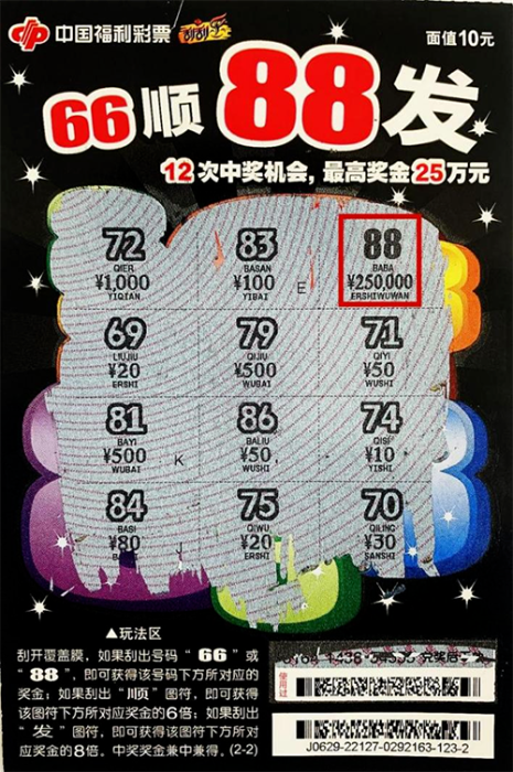 这是一个神奇的中奖故事。2月15日下午,小丛(化姓)和丈夫去甘井子区张前路乐都汇超市采购,结账后看见超市外摆放着一排福彩刮刮乐销售展示柜,外型很漂亮,当时有三四个人在选购,夫妻俩觉得很新奇。丈夫小李(化姓)曾经跟同事买过刮刮乐,但从来没在展示柜上投注过,妻子小丛完全没买过,看着展示柜里琳琅满目的福彩刮刮乐彩票,两人一拍即合,决定买一张回家刮着玩。也没有多犹豫,小丛一眼看中了面值10元的“66顺88发”彩票,觉得寓意很好,很符合新年喜庆的气氛。